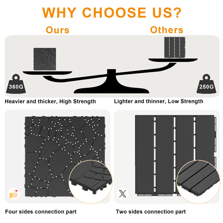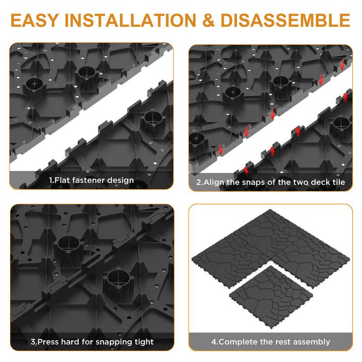 【Easy Snap Connection】Upgraded interlocking mode can realize faster and safer installation without any tools.Different from the snap design of other decking tiles, rectangular snaps makes the connection between flooring tiles closer and not easy to separate.You can also dismantle this outdoor tile in minutes with ease.
