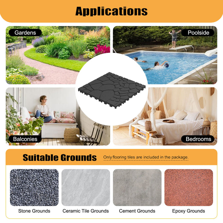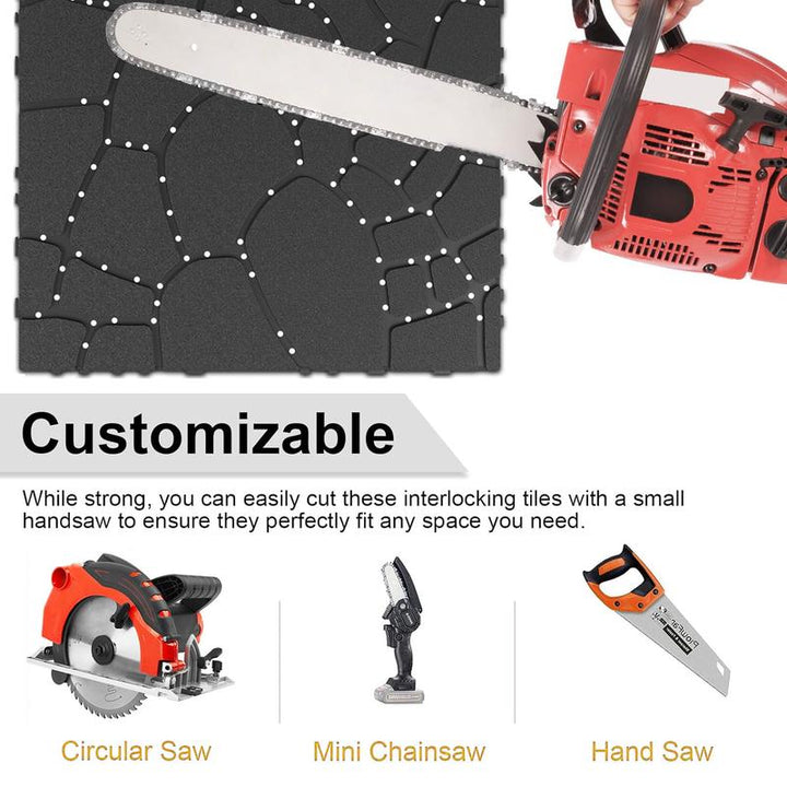 【Customizable & Versatile Use】Use a saw or other cutting tool to cut the plastic floors to the size you want. Fitting for putting this balcony deck tile in your patio deck, pools, garden, soft lawn, backyard, porch, outdoor playground, walkway and the other outside places. Or using in your bathroom, living room and the other indoor areas.