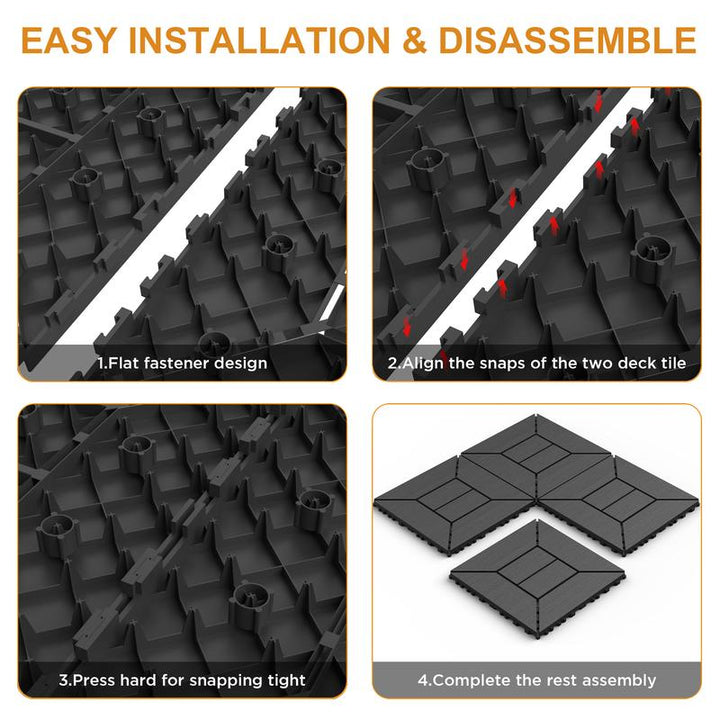 【Easy Snap Connection】Upgraded interlocking mode can realize faster and safer installation without any tools.Different from the snap design of other decking tiles, rectangular snaps makes the connection between flooring tiles closer and not easy to separate.You can also dismantle this outdoor tile in minutes with ease.