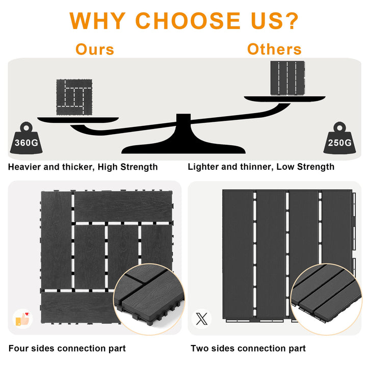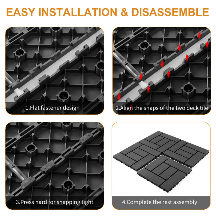 [Easy Snap Connection]Upgraded interlocking mode can realize faster and safer installation without any tools.Different from the snap design of other decking tiles, rectangular snaps makes the connection between flooring tiles closer and not easy to separate.You can also dismantle this outdoor tile in minutes with ease.